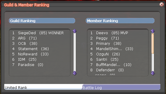 Siege and Memento Siege (Meme Siege) are two scheduled PvP modes that take place in the Siege Arena. Players face off in Guilds in a free for all deathmatch with a limited number of lives.
