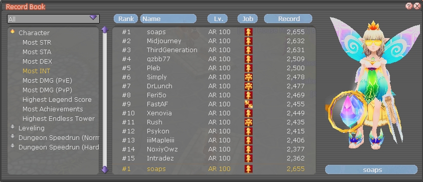 The Record Book is a way to show everyone what you're made of. The Record Book contains the server records for different Character stats (highest stats, highest damage, Legend Score, etc.), as well as Leveling records (fastest to 60, 120-H, AR100, etc.), and Dungeon Clear records (fastest time to complete each dungeon).