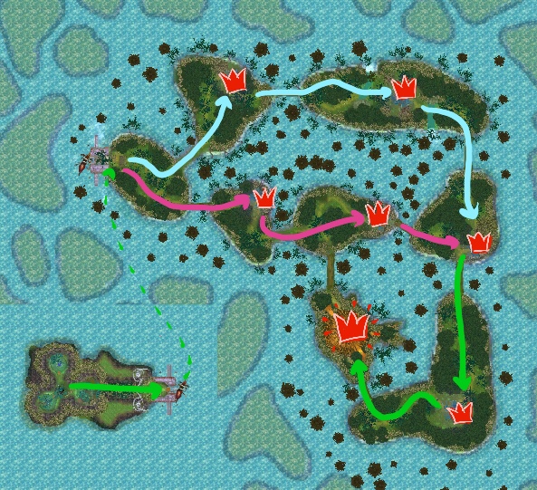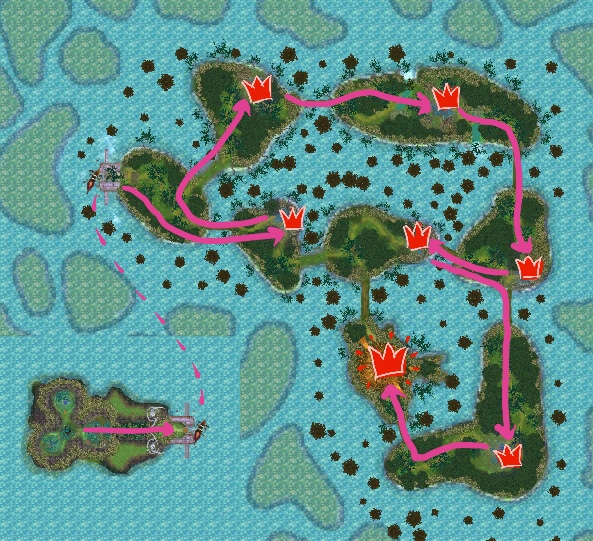 In the one route clear, you'll start by heading straight to take out the first totem. You'll then backtrack and make your way clockwise around the islands, destroying the second, third, and fourth totems. You'll have to take a short detour for the fifth totem, then backtack for the sixth totem, which will lead you to the boss.