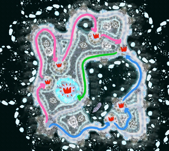 The two route clear of the dungeon sends one half of the team clockwise and the other counter-clockwise. The two teams will meet where the paths converge and make their way to the boss room together. It's fairly easy to full-clear Snowy Peaks using two routes.