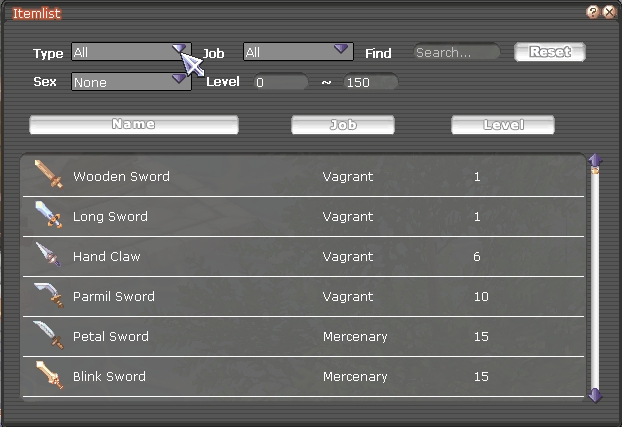 You can filter items by Type, Job, or Sex, search items by name, or sort by Name, Job, or Level. You can also add items directly to your Pet Filter whitelist or blacklist from by right clicking them.
