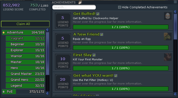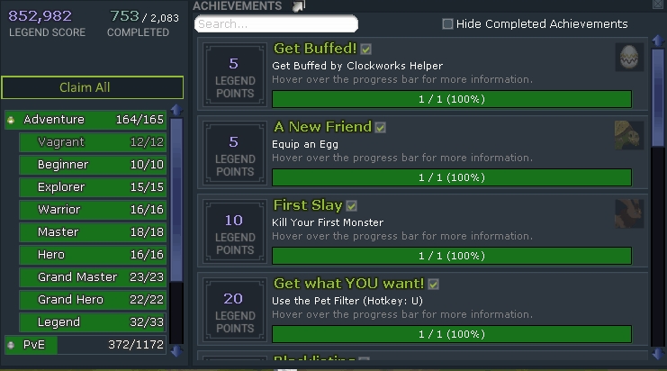 Once you've completed an Achievement, you can either claim that individual Achievement by finding it, or you can click "Claim All" to grab all the rewards at once. You can also click "Hide Completed Achievements" at the top right to see what you haven't done yet.