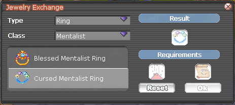 You can trade for Blessed and Cursed gear at the [Exchange] Reonan NPC in Flaris. Select whether you'd like to exchange for armor (set) or jewelry, then select use the dropdowns to find the exact item you're looking for exchange for.