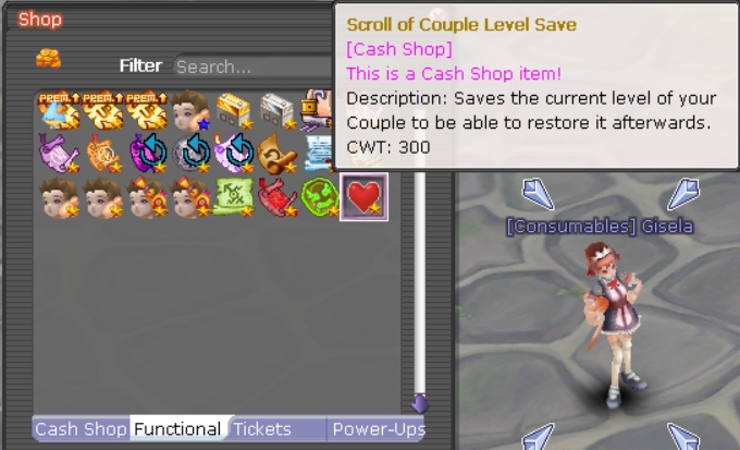 Scroll of Party Level Save is a premium item that can be purchased from [Consumables] Gisela in Flaris for 300 CWT. It allows you to transfer your couple level progress to a different couple.