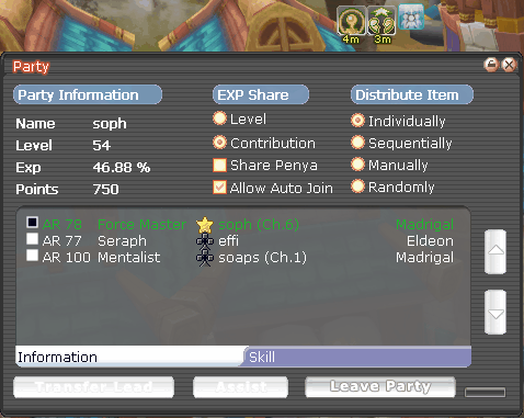 Party related scrolls, including Scroll of Party EXP (increase party EXP by 50%), Scroll of Party Skill (allows party skill duration to be stacked), and Enhanced Party Skill Range (more commonly known as "Red Scroll" can be purchased from [Consumables] Gisela in Central Flaris.