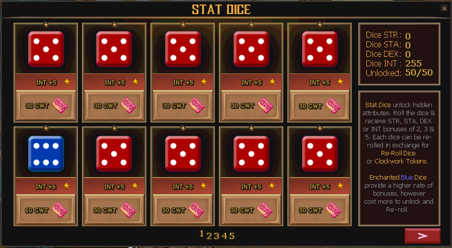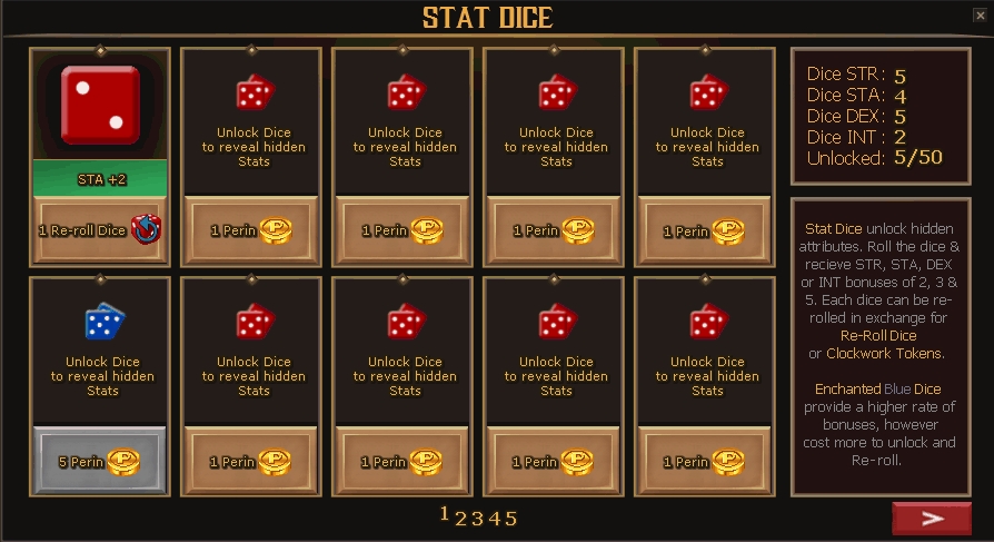 Stat Dice are a system to gain bonus stats, in addition to the stats you gain from leveling! You can unlock dice with Perins, and re-roll them using Re-roll Dice (obtained either through Achievements, chance boxes, Collecting, or CWT) or by paying 30 CWT directly.