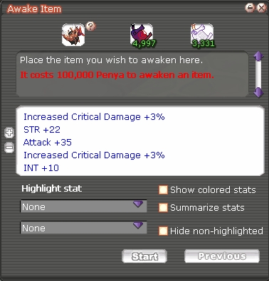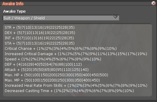 Awakenings are one of the most important upgrades, used to draw out the hidden power from your items. Raised pets, weapons and non-fashion armor can receive up to 3 lines of awakening, but level 150 weapons and armor can receive up to 5 lines of awakening.