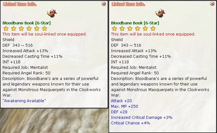 In addition to normal awakenings, weapons can be blessed (or cursed) by Angel Awakenings! Visit [Angel Shop] Gabriella in any major city to Angel Awaken your item. Unlike normal weapon awakenings, Angel Awakenings are only a single line.