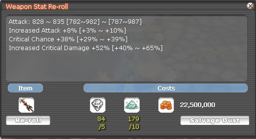 You can visit [Weapon Reroll] Dark in Flaris to re-roll a stat on your weapon by paying Jewels, Re-roll dust, and penya. However, when re-rolling weapons, there's a chance that the value will drop as well, so be careful!