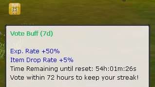 You'll also receive a Vote Buff depending on the length of your vote streak. At max level (7d streak), you'll receive a +50% Experience Rate bonus, in addition to a +5% Item Drop Rate bonus.