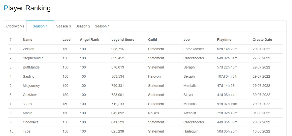 For both Season and main (Clockworks), Legend Score is also shown on the CW Flyff website, under Player Rankings.