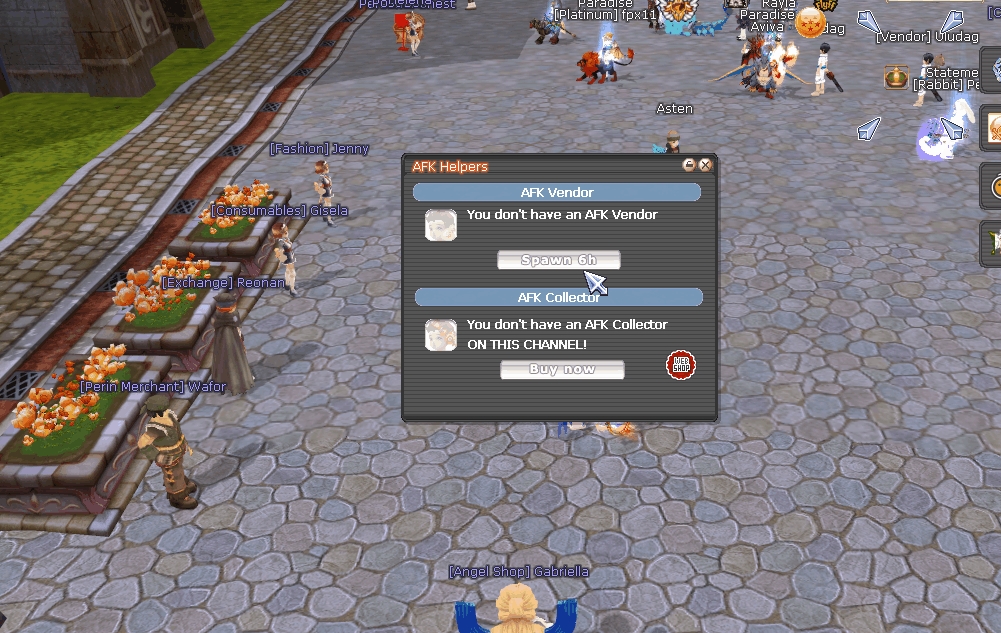 To use an AFK Vendor, first navigate to Saint Morning City on Channel 1. There, you can navigate to AFK Helpers from the Start Menu, or Start -> Features -> AFK Helpers.
