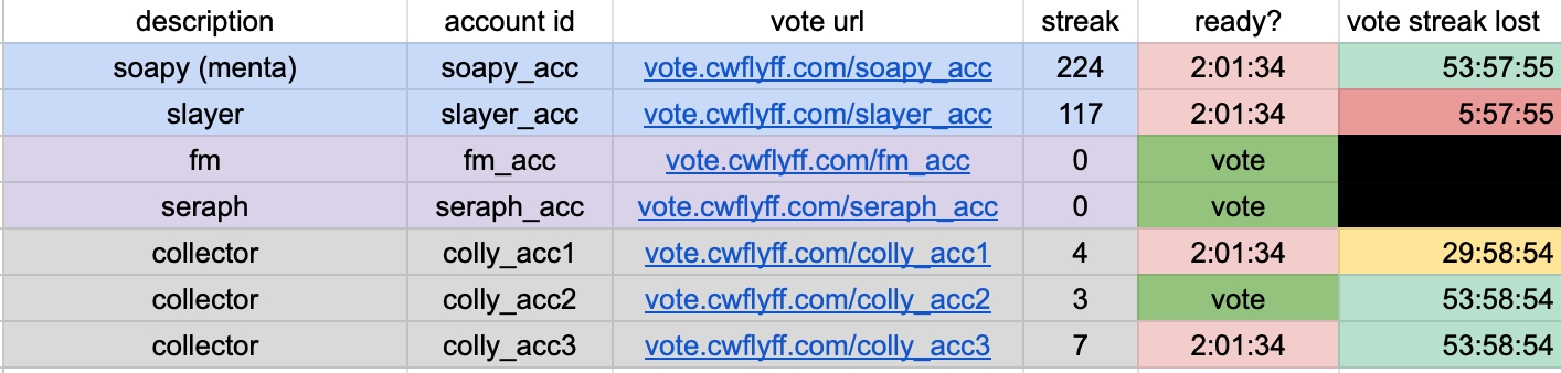 Another way to keep up with your voting is with the API Vote Tracker. Originally developed by Panisch and expanded by Soapy and Sapling, this tool uses Google Sheets to track your accounts, your current vote streaks, and lets you know when you can vote, in addition to when you'll lose your vote streak.